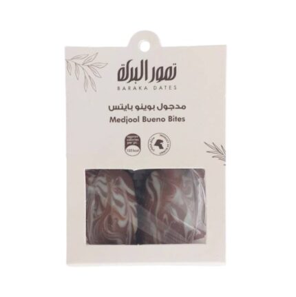 2 pieces of the irresistible Medjool bueno bites stuffed with the delicious popular hazelnut cream and dipped in Belgian milk